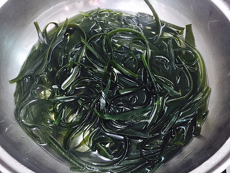 將海帶絲清水沖洗。放入鍋內(nèi)煮沸30秒。撈出瀝干水分