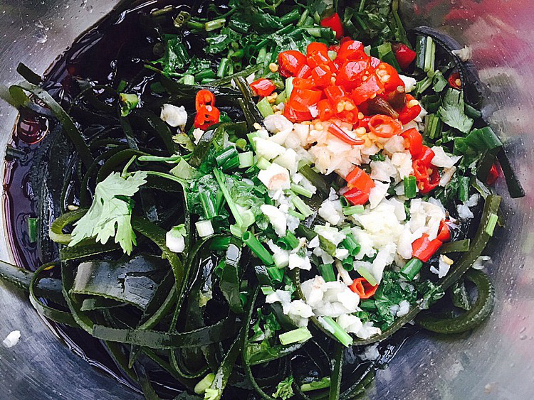 將油燒熱至微微冒煙,淋在蒜末、辣椒上面。小心濺到身上喔。最后將調(diào)料與海帶拌均勻既可。